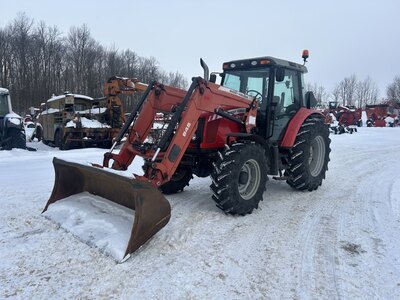 Massey Ferguson 5455 Dyna-4 with Massey Ferguson 945 loader. 4WD tractor with three sets of rear remotes. Cab has heat, AC, and radio. Machine was...